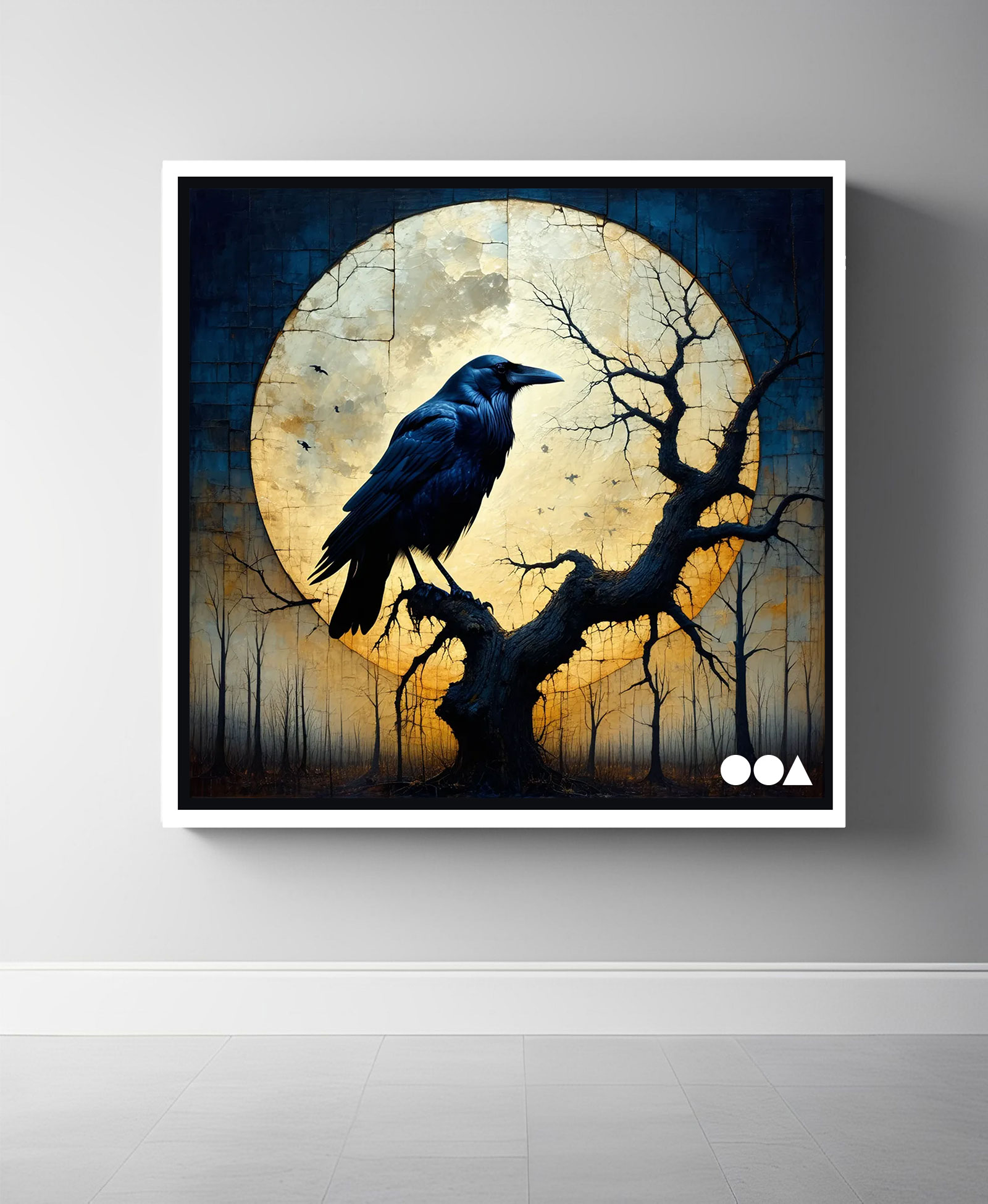 A spectral raven perches solemnly on the twisted branches of a lifeless oak, silhouetted against the haunting glow of a moonlit night. This abstract homage to Edgar Allan Poe’s The Raven captures the essence of solitude and mystery, blending shadowy forms with ethereal light. A visual poem of melancholy and timeless reflection, it invites viewers to wander the depths of its nocturnal reverie.