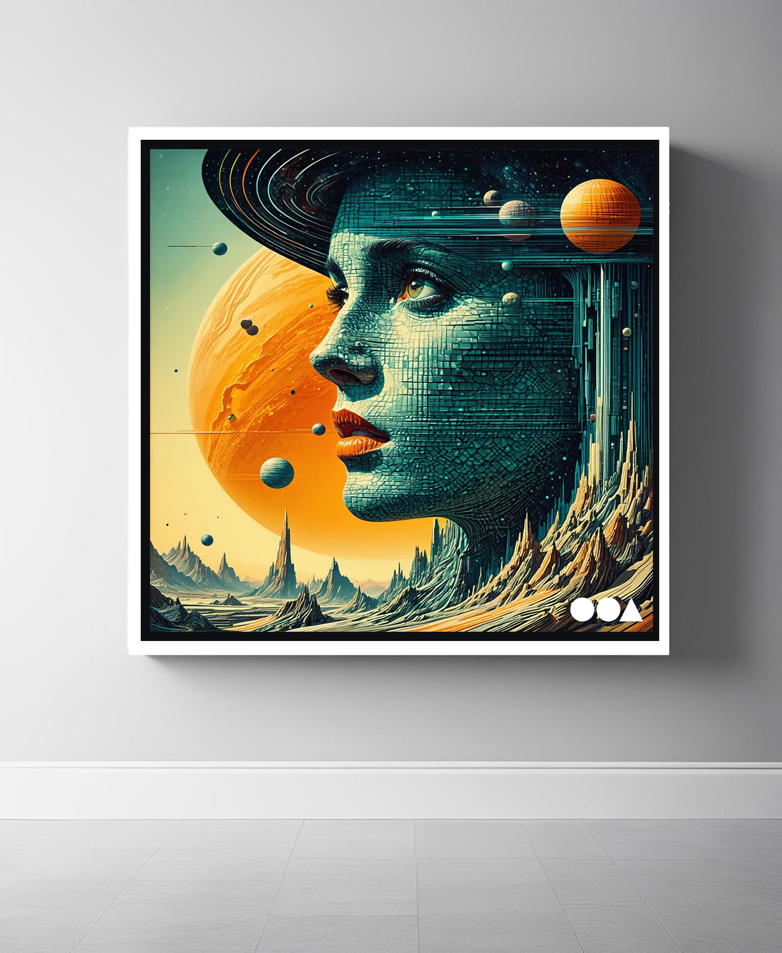 “Beacon” captures the essence of exploration and mystery, personified by the towering face that seems to both watch over and invite the viewer into a realm of limitless possibilities. It symbolizes the pull of the unknown, the beckoning of adventure, and the allure of cosmic discovery. The face, like a guiding light, stands as a beacon in the vast expanse, drawing travelers toward the uncharted. The blending of the human form with the alien landscape underscores the connection between the self and the infinite, where the journey itself becomes as important as the destination.