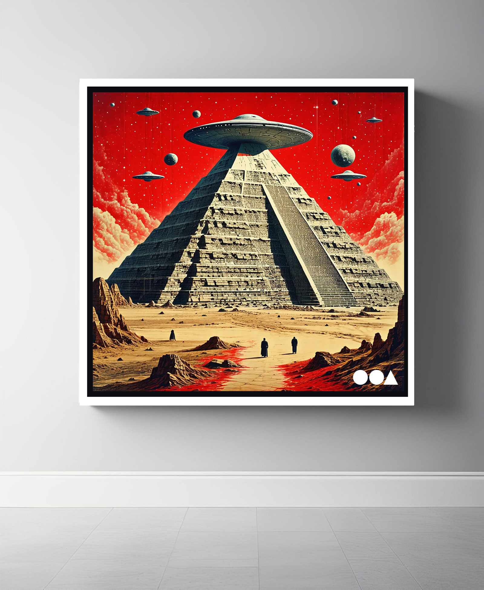 “A surreal tableau of a distant alien world, where a colossal pyramid stands as the central beacon under a fiery red sky. The pyramid, ominous and eternal, serves as a home base for a fleet of enigmatic saucers, gliding in formation across the burning horizon. This is no sanctuary; it is a dominion—an ancient realm steeped in blood rituals and offerings to celestial overlords. The pyramid’s dark geometry whispers of suppressed civilizations, bound in reverence or rebellion against their interstellar oppressors. The sky burns not with life but with an eternal reminder: power, whether divine or alien, demands its price.”