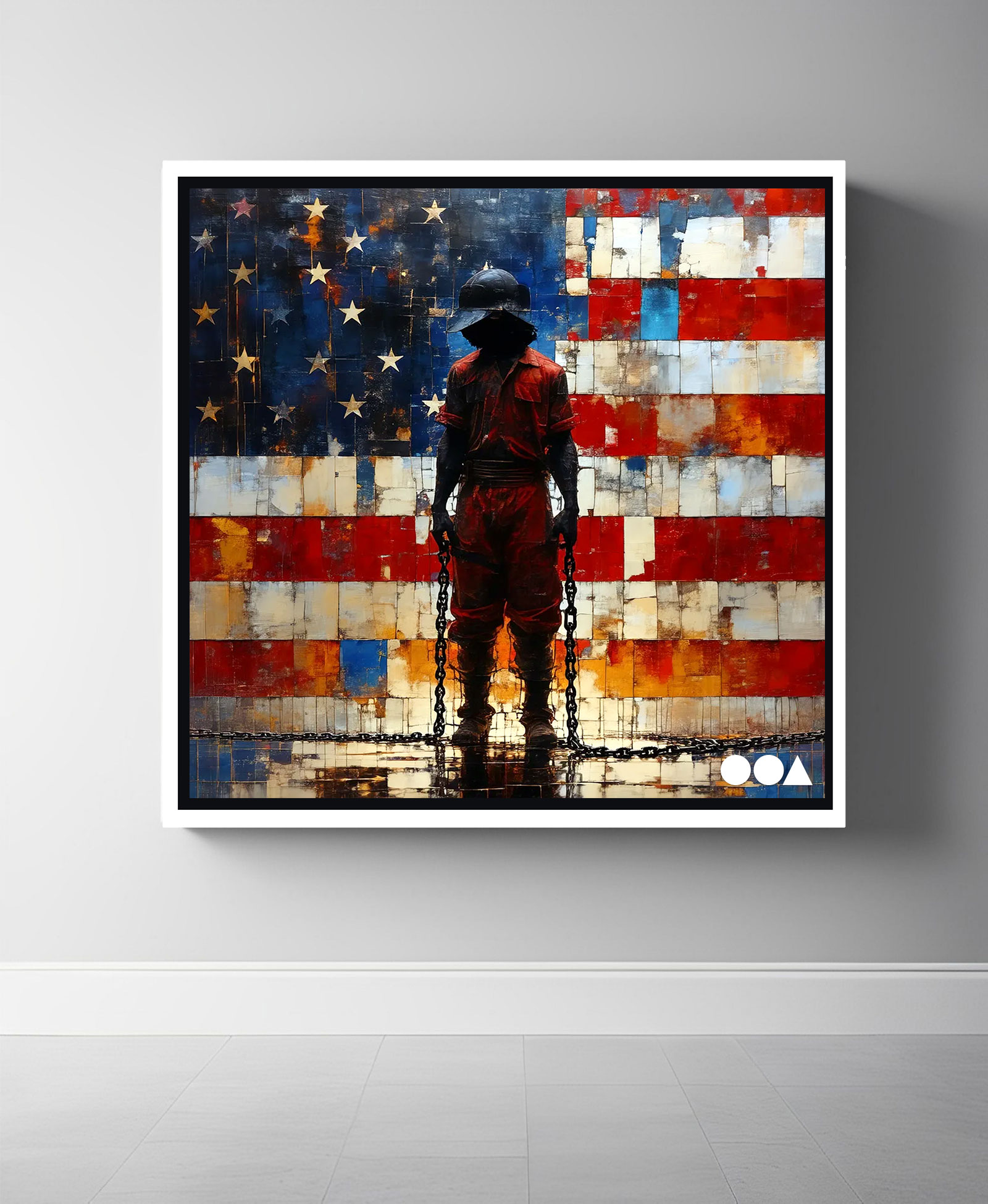 “bound to the earth by chains that echo the weight of oppression. Draped in the bright orange of confinement, they face the looming American flag – a symbol of freedom, yet one that has failed to shield them. The contrast between the flag’s promise and the figure’s restraint speaks to the silent struggle for justice, a stark reminder of how the banner can bind as much as it can liberate.”