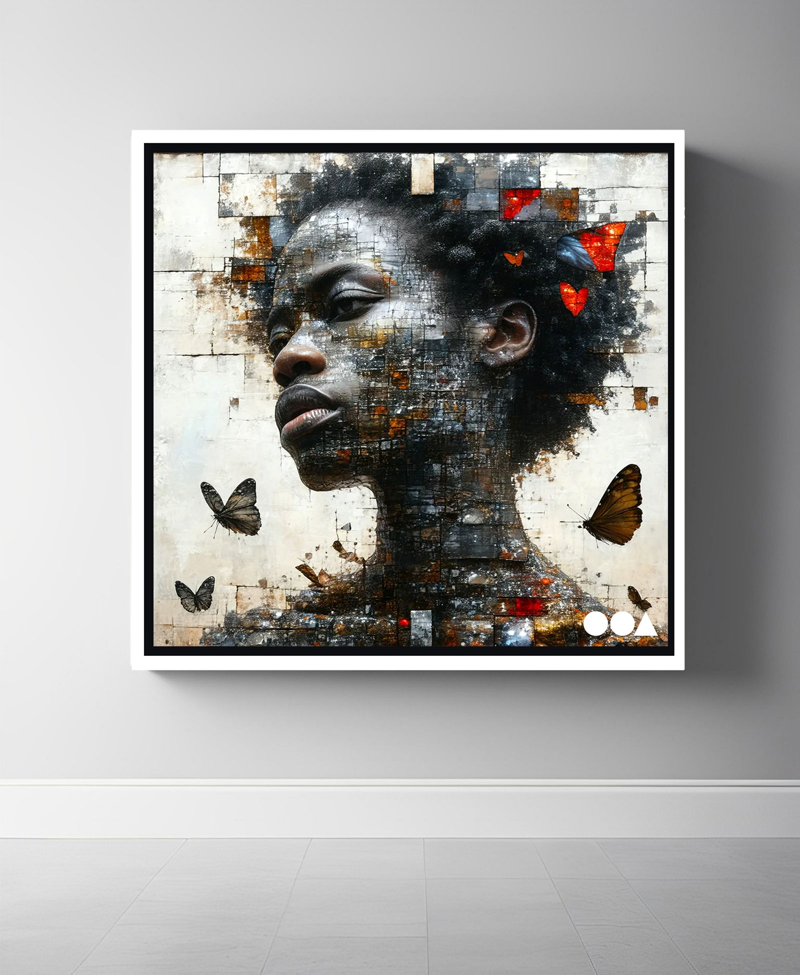 “His form stands tall, the weight of his chains now lifted, but their echoes linger on his skin and in his soul. The gaze of the freed man is not one of pure triumph but of uncertainty, as the horizon before him is shrouded in both hope and hesitation. The scars he carries are more than physical; they are the remnants of a history that cannot be undone. The artwork speaks to the fragile promise of freedom—a hard-won liberation still shadowed by the struggles of a future unknown.”