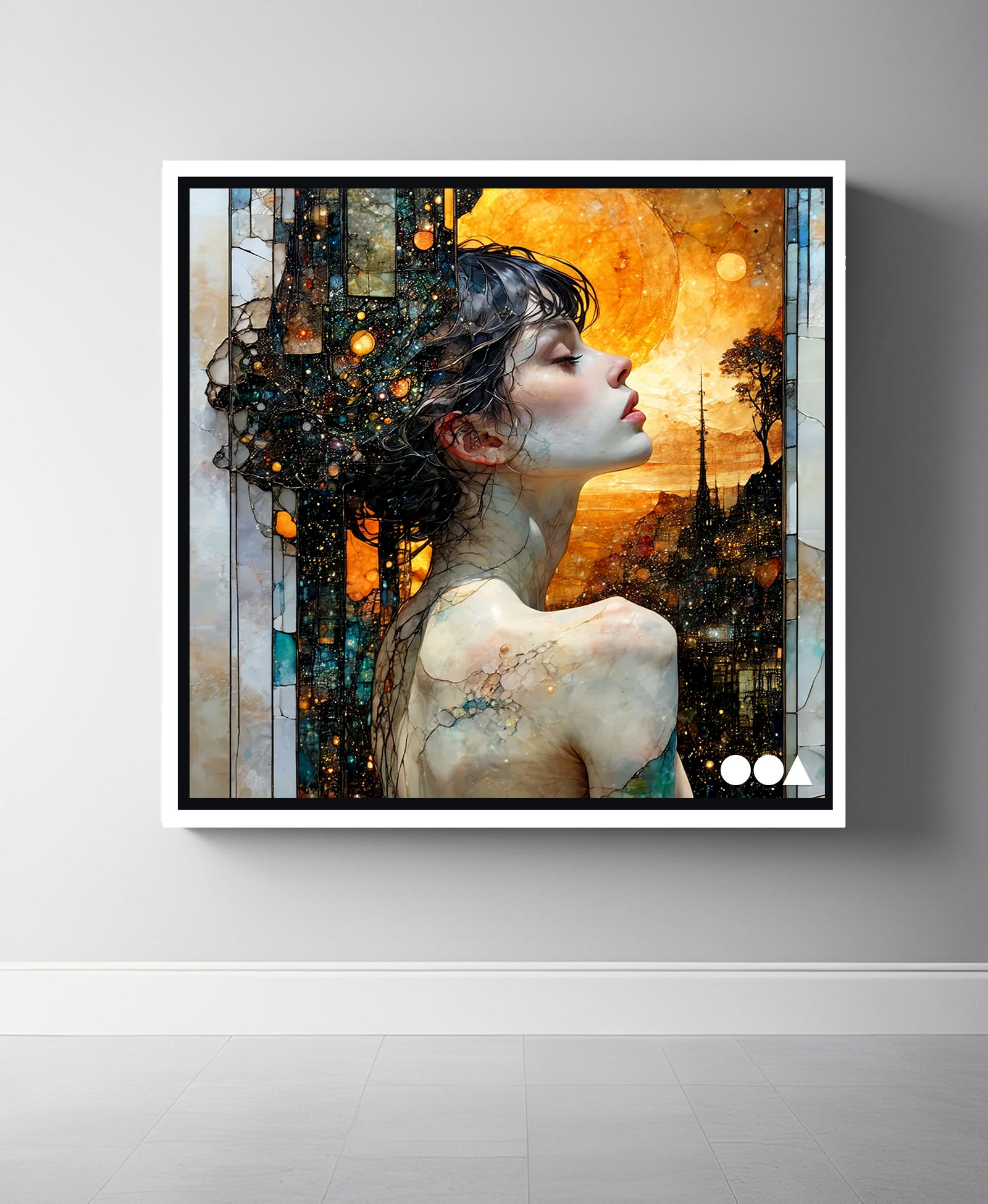 “Poised in meditation, becomes one with the abstract void surrounding her. Her calm presence, suspended within a transcending wall of shifting forms, symbolizes the harmony between inner peace and the infinite expanse of the unknown. ‘Embedded Beauty’ speaks to the stillness found in the midst of chaos, where beauty is not just seen but felt, transcending the boundaries of the material world.”