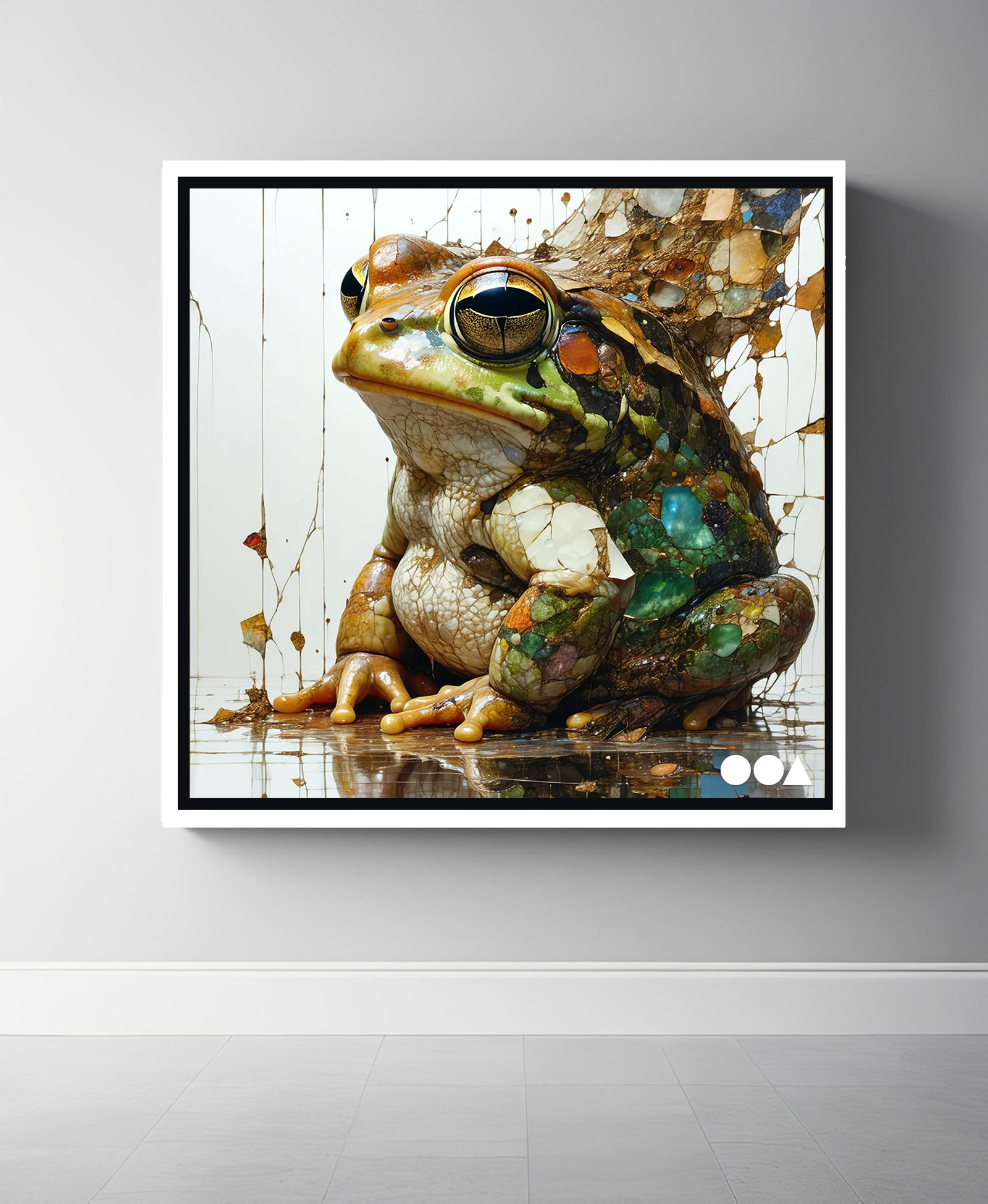 An enigmatic visage of a toad, its textured skin a mosaic of ancient earth and jeweled moss. Eyes like polished amber hold the weight of quiet wisdom, reflecting a world both mystical and raw. The close-up unveils the delicate balance of beauty and grotesque—a guardian of the undergrowth, a sentinel of shadowed waters. “Emerald Warden” whispers of forgotten realms, where life hums softly in the stillness of the unseen.