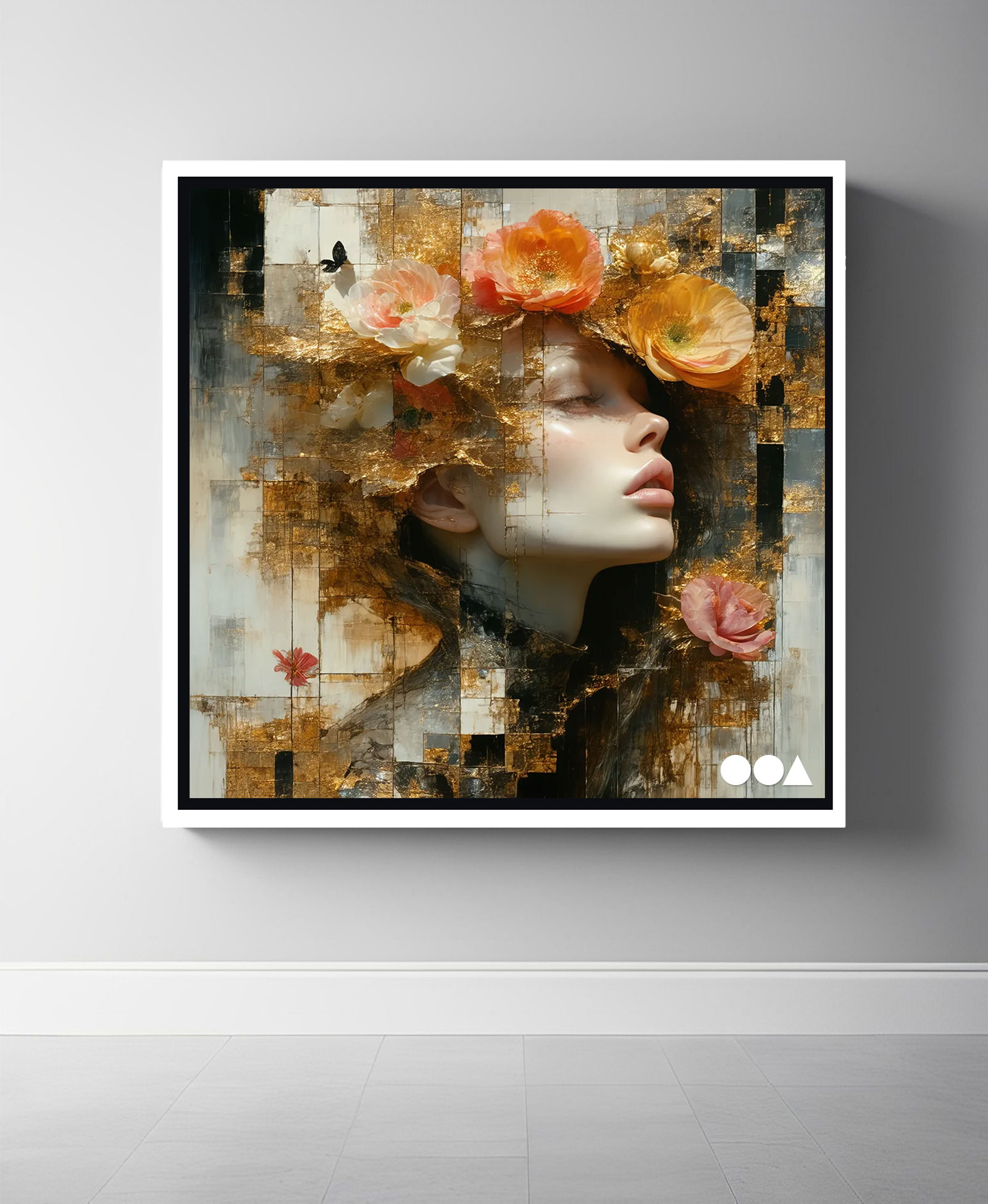 “Drifting into a state of transcendence, her features dissolving into an ethereal bloom of floral and golden thoughts. The interplay of organic and abstract shapes evokes a timeless elegance, where beauty is neither bound by form nor fleeting. In this dreamlike fusion, she becomes a symbol of the infinite – a harmony of grace, nature, and the divine.”