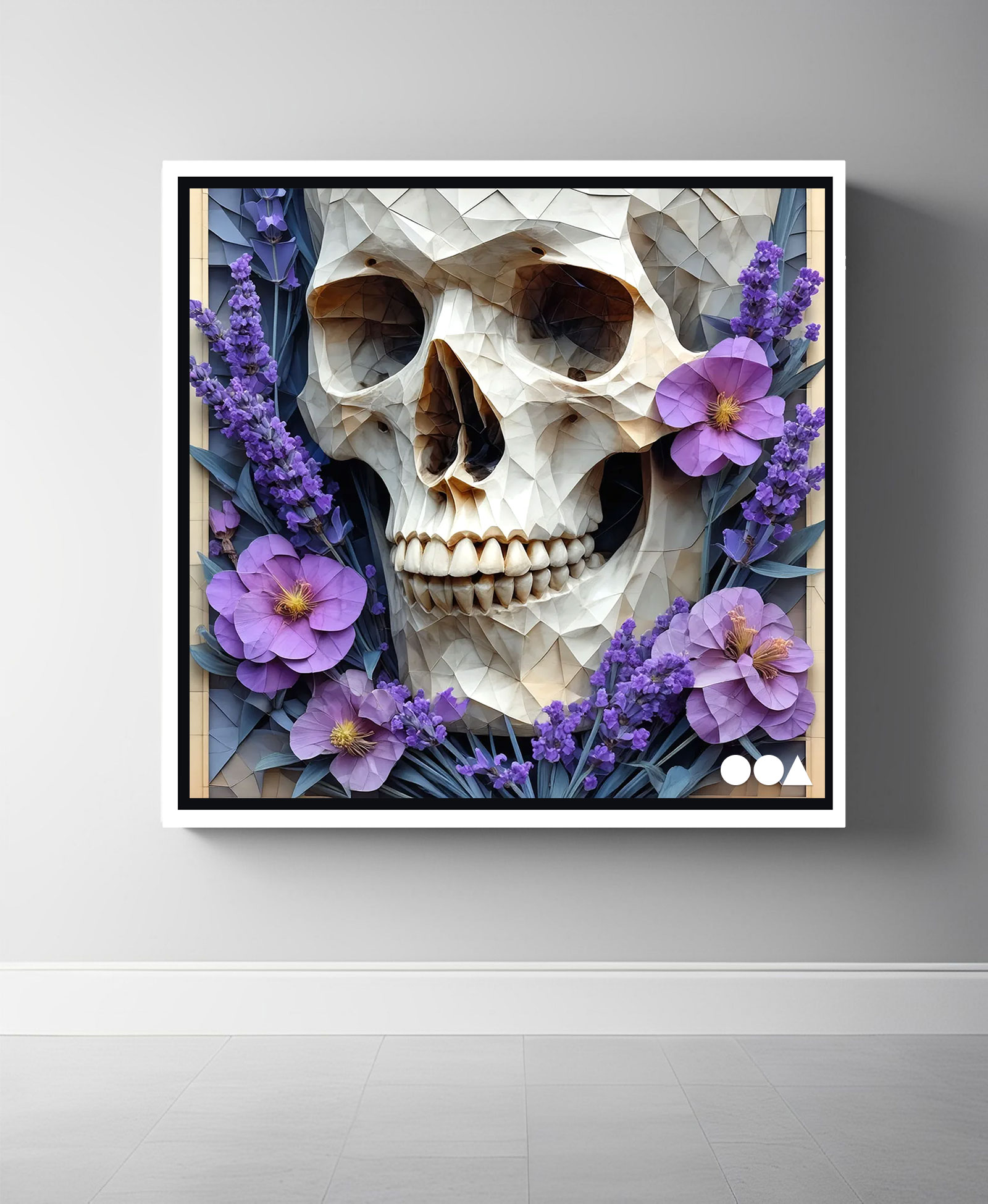 “A delicate dance between fragility and resilience, this abstract piece juxtaposes the stark permanence of a skull with the tender vibrancy of lavender blooms. The flowers, symbols of grace and renewal, weave their fragrant tendrils through the hollowed contours of mortality, softening its inevitability. Lavender’s soothing essence contrasts the unyielding bone—a reminder that even in the presence of decay, beauty persists, and life’s ephemeral fragrance lingers beyond its final breath.”