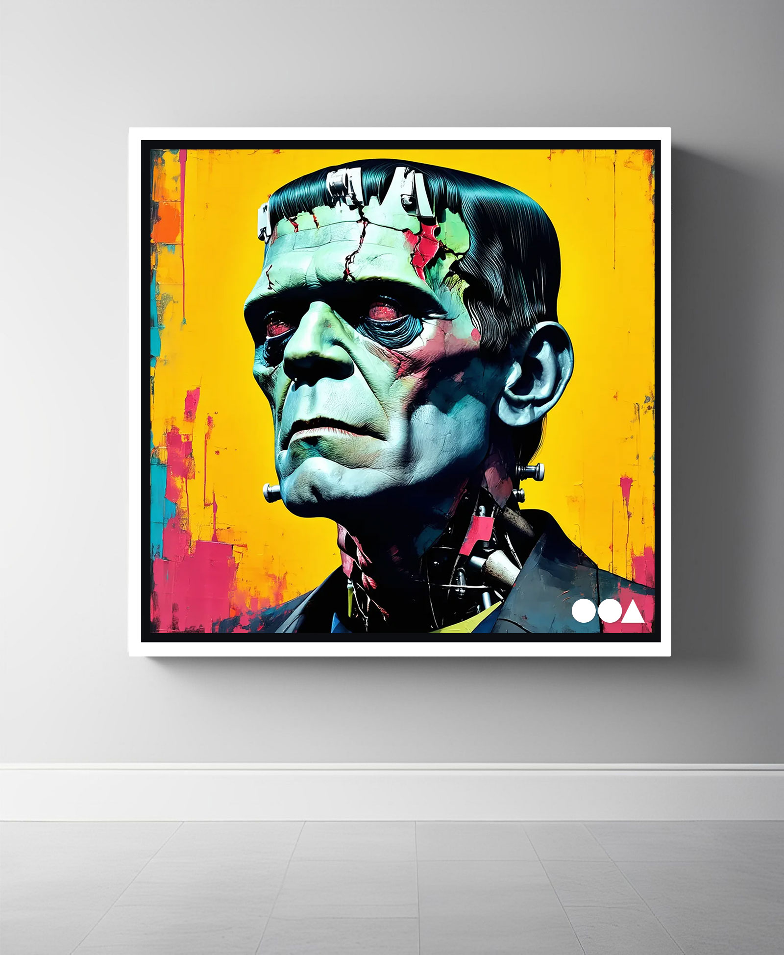 “In a riot of vibrant color, the misunderstood monster takes center stage- a homage to the titans of classic horror. Frank reimagines Frankenstein’s creature as a symbol of the genre’s enduring legacy, celebrating the artistry and imagination that brought cinema’s most haunting characters to life. Bold and electric, this portrait is a love letter to the macabre, blending terror with timeless style.”