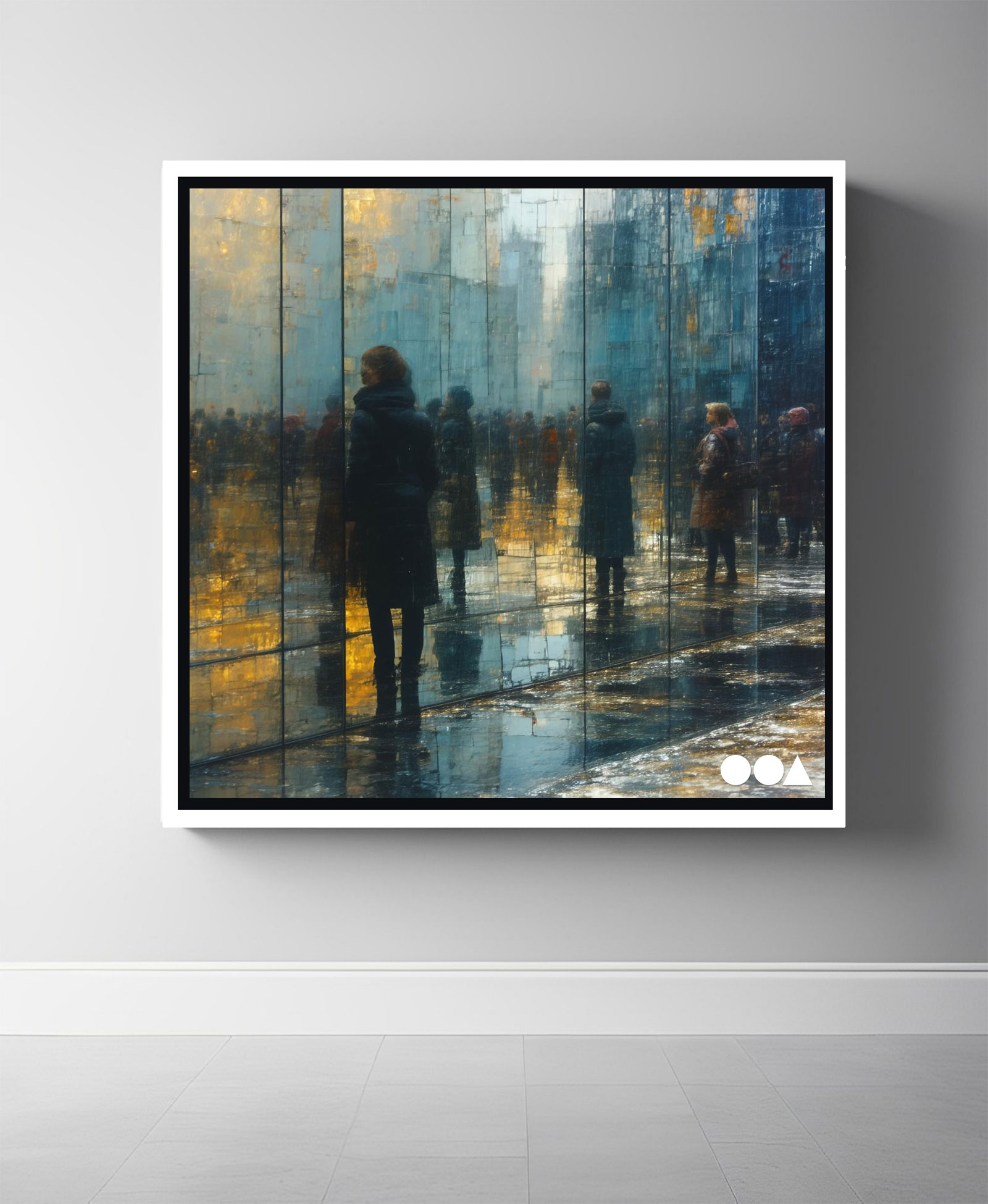 “Unnamed persons dissolving into one another, blurring into an indistinct mass. Each figure is faceless, disconnected, and unseen, lost in the fog of their own solitude. The crowd hums with a quiet ache, a haunting symphony of unspoken words and unrealized connections, where individuality fades into a cloud of isolation.”