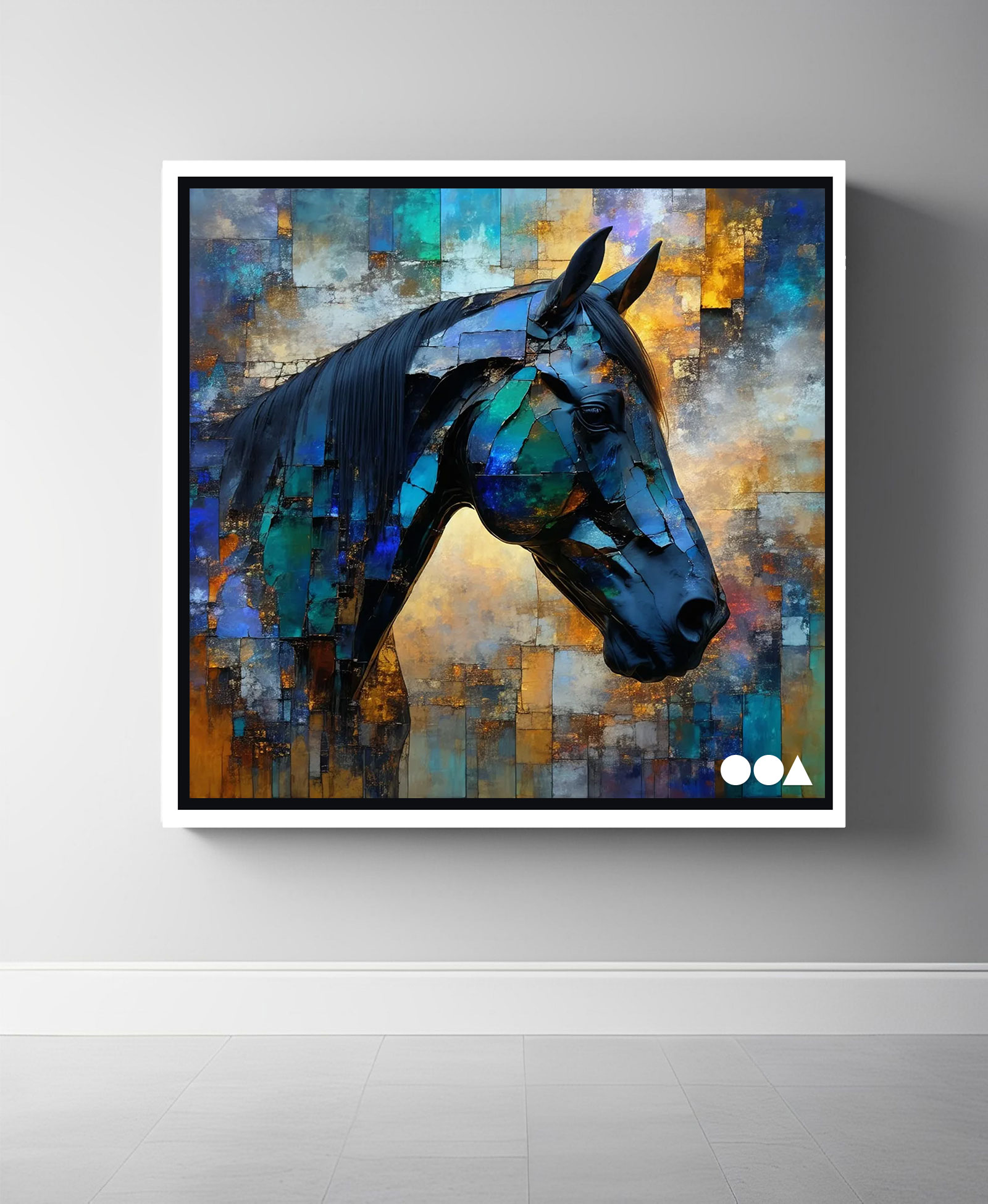 “Night’s Grace captures the majestic power and serene elegance of a black horse, abstracted in a portrait that evokes both mystery and beauty. Set against a vibrant, swirling backdrop of rich, luminous hues, the horse’s form emerges from the depths of the canvas like a shadow in the night—graceful, untamed, and full of quiet strength. The contrast between the dark figure and the dynamic, colorful surroundings speaks to the animal’s connection to both the earth and the cosmic unknown. It is a portrait not only of the horse but also of the grace found in the balance between light and dark, stillness and movement, the known and the unseen. “