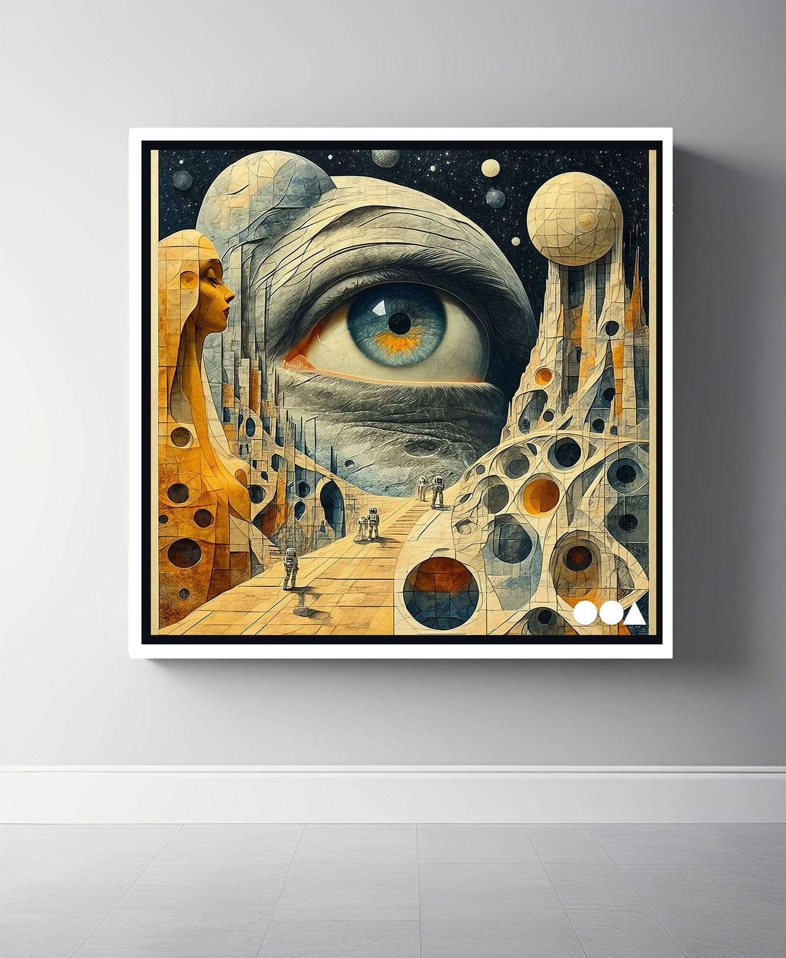 Beneath a canopy of cosmic wonder, a surreal planet unfurls its alien expanse. Its surface, textured with mysteries, is both strange and beautiful, paved with an ancient road where tiny, astronaut-like figures journey toward the unknown. Sculptures of unfathomable design and alien architecture rise like echoes of another dimension, casting shadows of forgotten eras. Above it all looms a colossal moon, its surface alive with the presence of a single, all-seeing eye—a silent guardian watching over this enigmatic interstellar vision.