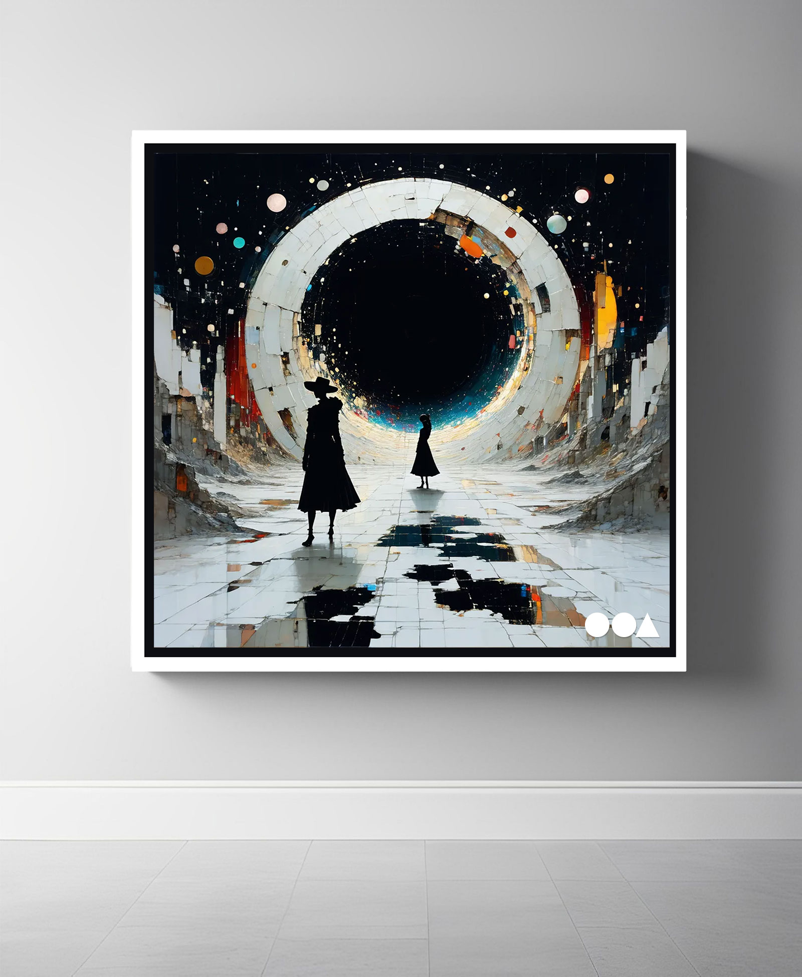 “On the precipice of infinite possibility, two silhouettes stand at the threshold of a colossal portal, its swirling depths beckoning from beyond the stars. The surreal landscape stretches into the unknown, where the fabric of reality bends and twists. Are they leaving a world they know, or stepping into an entirely new existence? In this moment of uncertainty, time and space collapse, and the edge of singularity blurs the line between departure and arrival.”