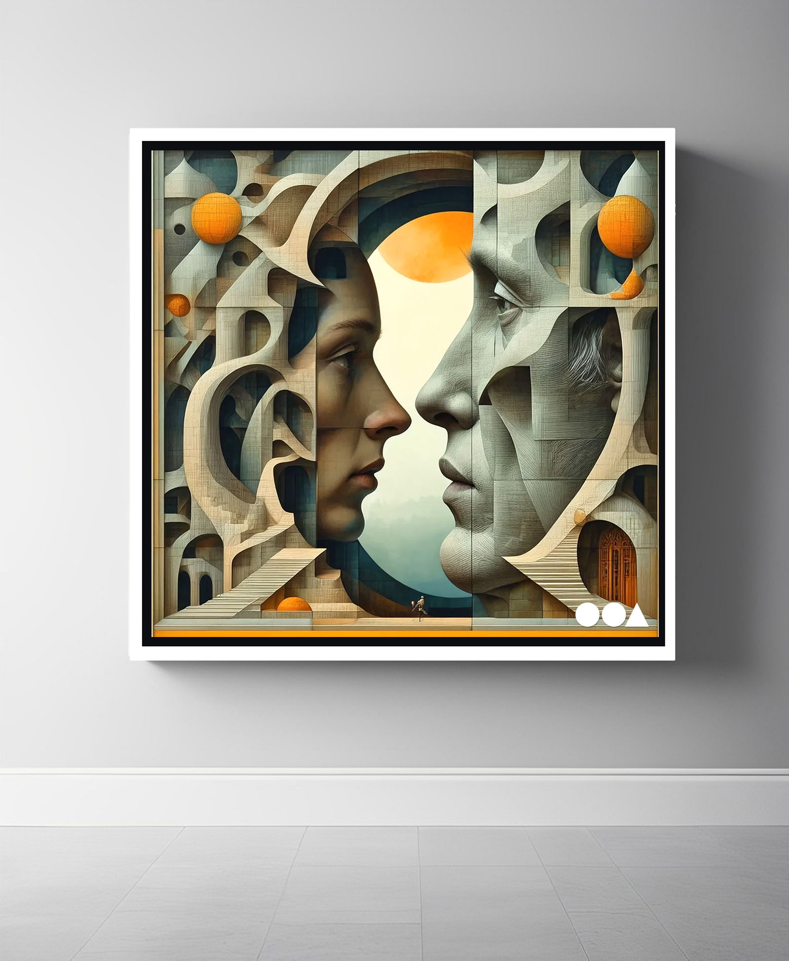 “Together, Apart” delves into the intricate dance of human connection. Two cubistically abstracted faces—male and female—face one another, their geometric complexities mirroring the multifaceted nature of individuality. Despite the disjointed edges and fragmented forms, delicate bridges of shared understanding stretch between them, glowing with a sense of fragile yet resilient unity. The composition speaks to the struggles of relationships—the unspoken battles, the silent compromises, and the hard-won connections that emerge amidst the fractures. Through its layered abstraction, the piece underscores the importance of love as the ultimate thread weaving through the chaos, binding two equally complex souls into a singular, evolving whole.